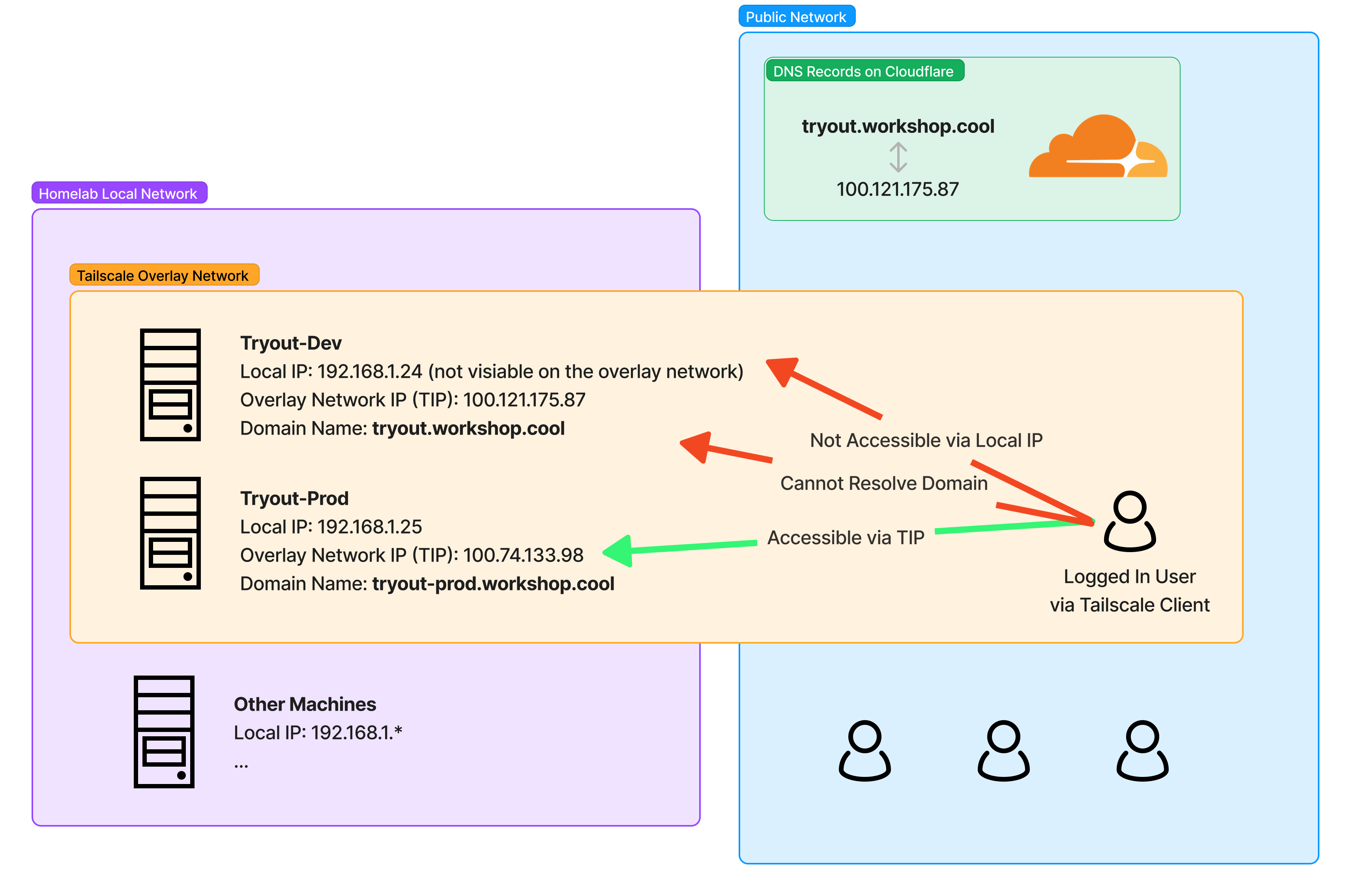 Once people logged into the overlay network via tailscale, the VM could ba accessed via ssh user@tryout.workshop.cool